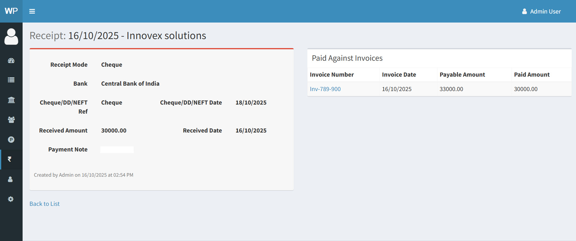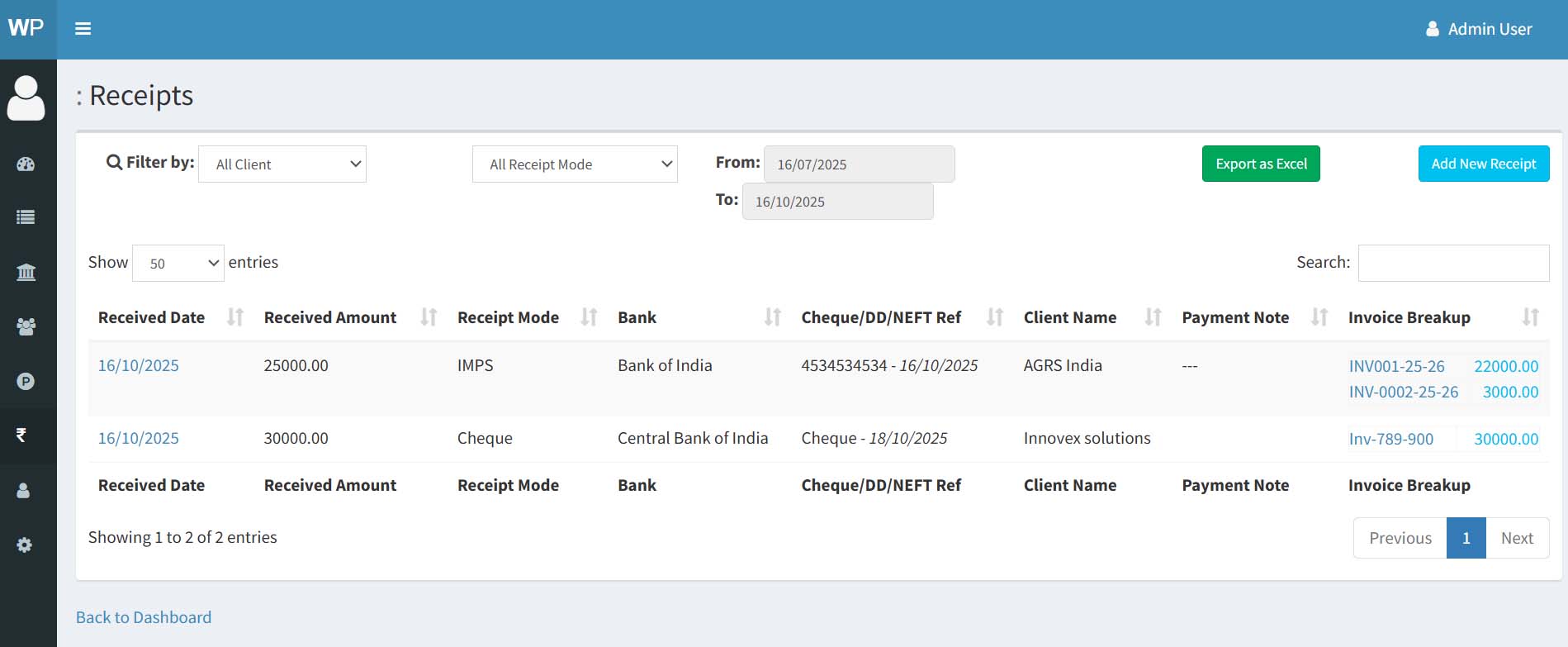 The system also includes a comprehensive payment management module that records client payments, tracks payment status, and generates invoices. It supports multiple payment types and statuses, including: